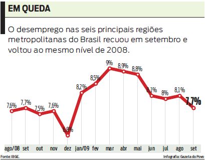 A taxa de desemprego das seis principais regiões metropolitanas do país cedeu de 8,1% em agosto para 7,7% em setembro e voltou ao patamar pré-crise. Repetiu a marca de setembro de 2008 e foi a menor desde dezembro daquele ano (6,8%).