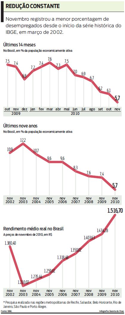 A queda da taxa de desemprego para a mínima histórica de 5,7% em novembro, anunciada ontem pelo Instituto Brasileiro de Geografia e Estatística (IBGE), mostra que "o mercado de trabalho segue bastante aquecido e pressiona fortemente a inflação", destaca a economista do Banco Santander Luiza Rodrigues, já que há mais dinheiro circulando na economia. "Há uma discussão sobre se o Brasil estaria em um processo de desindustrialização. Os números, no entanto, não mostram isso", diz ela, acrescentando que o número de empregados da indústria cresceu 0,9% em novembro. O setor tem alegado que a competição desigual dos produtos importados, beneficiados pelo dólar baixo, levaria ao fechamento de fábricas no Brasil.