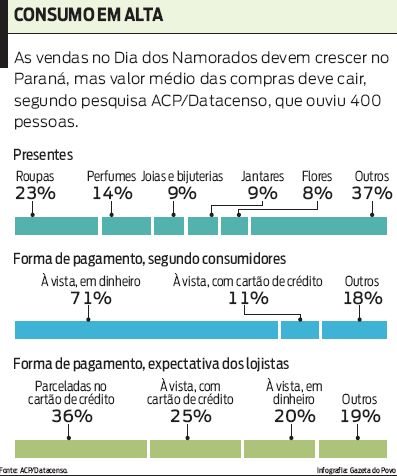 O consumo no Dia dos Namorados em Curitiba deve ser 13% maior em 2011 em comparação com o ano passado, segundo pesquisa divulgada ontem pela Associação Comercial do Paraná (ACP). O levantamento da ACP/Datacenso mostra, porém, que o valor médio da compra deve ser 11% menor do que o verificado no ano passado. Enquanto em 2010 os namorados gastaram, em média, R$ 172 por compra, neste ano os casais devem puxar o freio no consumo e gastar, em média, R$ 155.