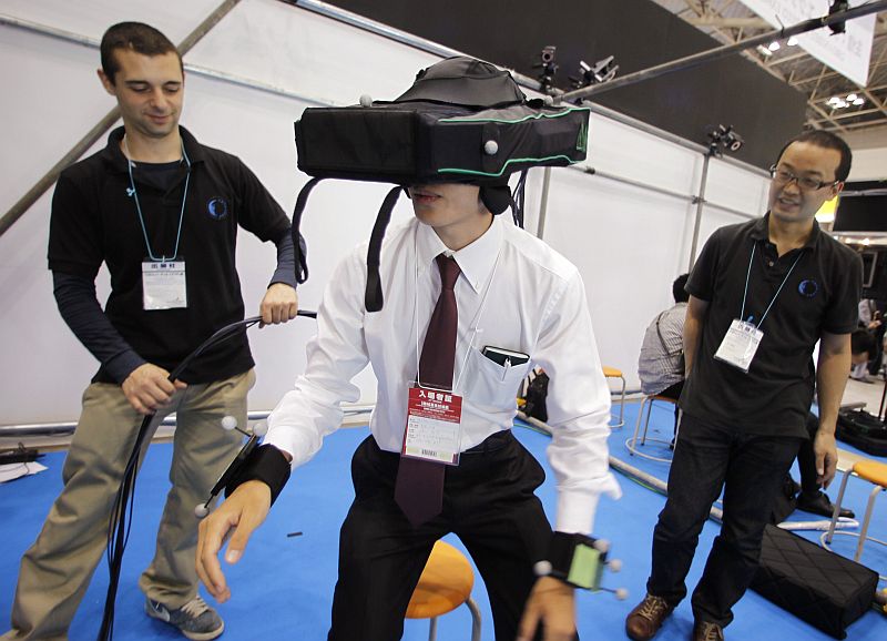 Um visitante experimenta um simulador na 3D and Virtual Reality Expo, mostra realizada em Tóquio com produtos ligados à realidade virtual. O equipamento inclui um capacete com telas no lugar dos olhos, para dar ao usuário a ilusão de estar perfeitamente imerso em um mundo virtual. A exposição ocorreu de quarta a sexta-feira e reuniu as principais indústrias e centros de pesquisas do país asiático.