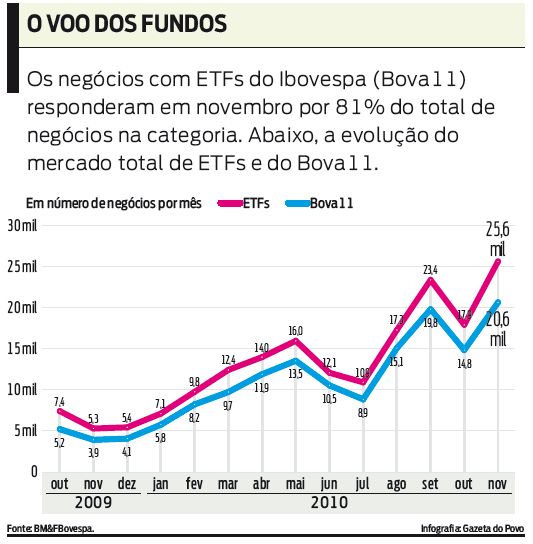 Lançados no Brasil há dois anos, os fundos do Ibovespa se tornaram uma febre entre os pequenos investidores estrangeiros, que representam 21,2% do volume de ETFs negociados na Bovespa em novembro. Já a participação de investidores brasileiros como pessoas físicas foi de 13,4%, contra 11% em novembro de 2009. A maior participação, entretanto, continua sendo a de investidores institucionais, com 43% do volume negociado de ETFs.