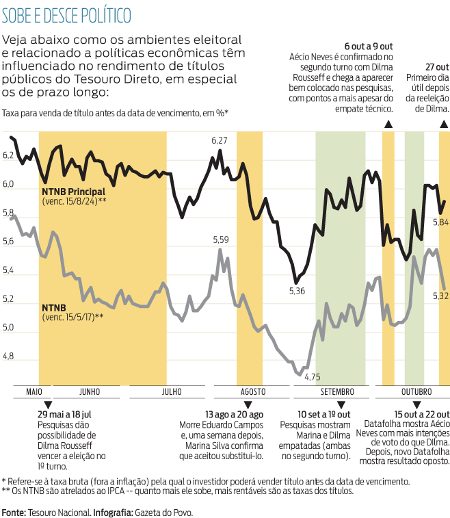 Parte da explicação tem a ver com a perspectiva do mercado em relação à reeleição da presidente Dilma Rousseff. Para investidores, essa projeção vinha atrelada a uma maior possibilidade de aumento de juros e de inflação, o que joga para cima rendimentos de títulos indexados pelo IPCA e pela Selic, a taxa básica de juros.