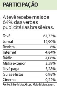 Do total investido, a televisão se mantém como a principal mídia, com faturamento de R$ 3,67 bilhões e participação de 64,33% no total do bolo publicitário. Mesmo com a queda, o meio jornal aparece na segunda posição, com faturamento de R$ 736,4 milhões e participação de 12,9%. Na se-quência aparecem as revistas, com faturamento de R$ 342,4 milhões (participação de 6%); internet, com R$ 264,6 milhões (4,64%); mídia exterior, com R$ 204,8 milhões (3,59%) e TV por Assinatura, com R$ 187,1 milhões (3,28%).