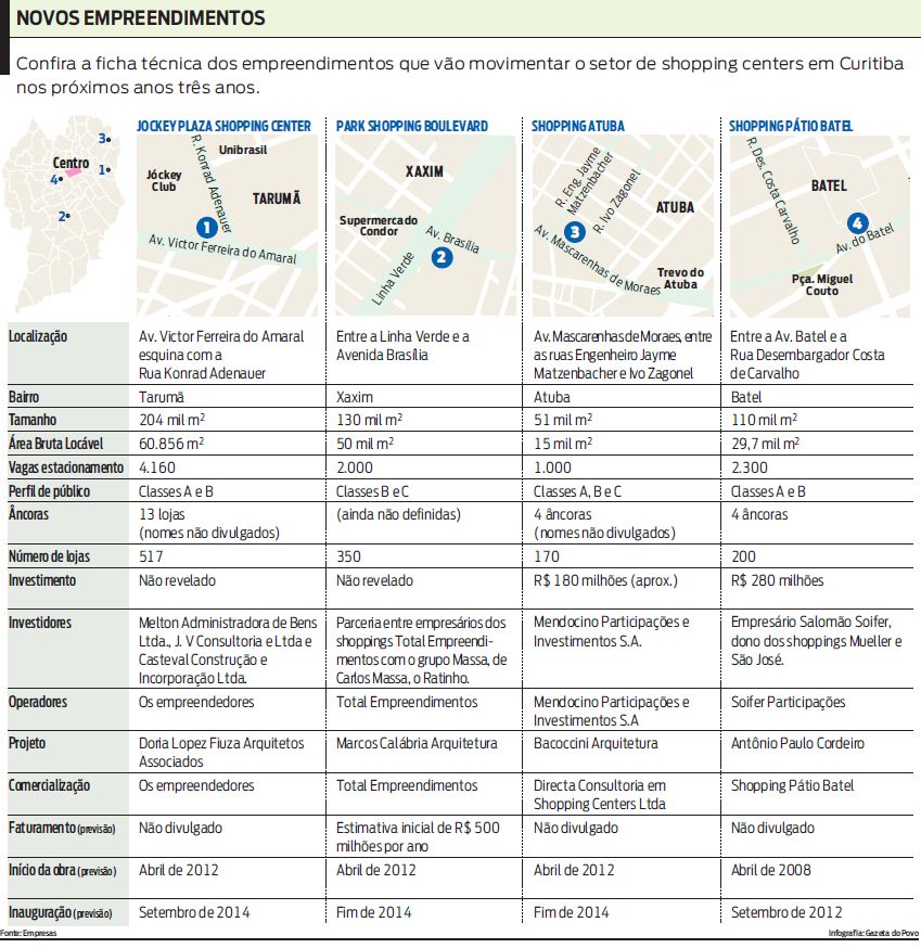Além da inauguração do Pátio Batel, prevista para setembro de 2012, três novos empreendimentos começam a sair do papel no próximo ano em Curitiba: o Shopping Atuba, na região norte, o Park Shopping Boulevard, próximo à Linha Verde, no bairro Xaxim, e o Jockey Plaza Shopping Center, no Tarumã. Juntos, os quatro novos shoppings somam mais de 1.200 lojas e representam um aumento de 54% na oferta de área bruta locável (ABL) da capital paranaense.