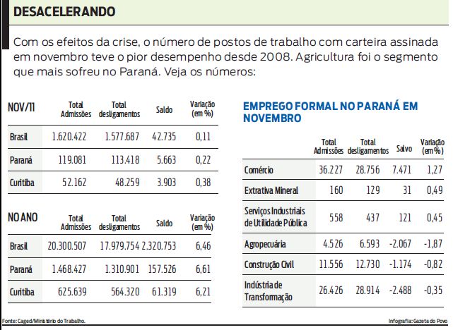 A economia brasileira teve em novembro seu pior desempenho na geração de postos de trabalho com carteira assinada em 2011, segundo dados do Cadastro Geral de Empregados e Desempregados (Caged). As 42,7 mil vagas criadas em todo o país representam também o pior resultado para meses de novembro desde 2008, quando o saldo líquido ficou negativo em 40.821 em razão do estouro da crise econômica internacional. Na comparação com o mesmo período do ano passado, quando foram criadas 138,2 mil vagas, a queda foi de 70%.Segundo o Ministério do Trabalho, o "modesto desempenho" decorreu da conjugação de fatores sazonais e conjunturais. O documento reconhece que os efeitos da crise internacional estão repercutindo com maior intensidade na indústria de transformação, que, nos últimos meses, demonstrou sinais de perda de dinamismo.