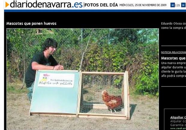 Uma empresa em Navarra (Espanha) abriu um serviço curioso. O novo negócio oferece a possibilidade de alugar galinhas poedeiras durante duas semanas ou mais tempo, segundo reportagem publicada pelo "Diario de Navarra".A empresa foi criada pelo espanhol Eduardo Otxoa Rodrigo, que se inspirou em um negócio parecido que funciona na Austrália. Rodrigo montou, inclusive, uma página na internet (alquilaunagallina.com.es) para oferecer o serviço.