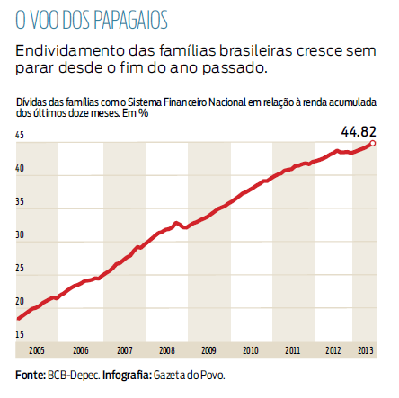 O endividamento das famílias brasileiras com o sistema financeiro cresceu em junho pelo sexto mês consecutivo e bateu novo recorde. O valor total das dívidas correspondia, naquele mês, a 44,82% da renda do trabalhador nos últimos 12 meses, de acordo com o Banco Central (BC), contra 44,52% em maio (recorde anterior). No fim de 2013, estava em 43,41%. Em junho de 2012, em 43,18%.