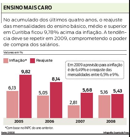 Manter os filhos em uma escola particular no Paraná deve ficar entre 6,5 e 9% mais caro em 2009. Apesar de cada escola ter autonomia para fixar o preço das mensalidades de acordo com seus custos, o Sindicato dos Estabelecimentos Particulares de Ensino do Paraná (Sinepe-PR) prevê os reajustes dentro desta banda com base nas projeções do Índice Nacional de Preços ao Consumidor (INPC), índice medido mensalmente pelo IBGE nas onze principais regiões metropolitanas do país.