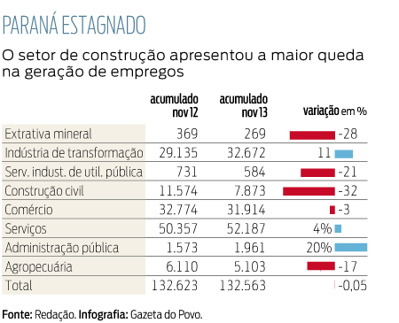 Na comparação entre o acumulado até novembro de 2013 e o do ano anterior, o setor que mais teve queda na geração de empregos foi o da extrativa mineral (-77%), construção civil (-33%), comércio (-18%), serviços (-16%), agropecuária (16%) e serviços industriais de utilidade pública (-7%).