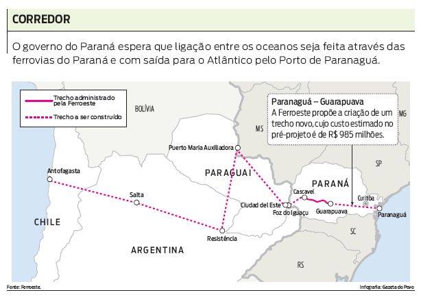 O Paraná, no entanto, também "disputa" a participação no corredor. Mais do que isso, o presidente da estatal Ferroeste, Samuel Gomes, tem como certo o contato com o Atlântico através do Porto de Paranaguá. Dois projetos da Ferroeste completariam o trecho brasileiro do corredor: o trecho entre Paranaguá e Guarapuava a estatal já apresentou um pré-estudo de viabilidade ao governo federal e um novo ramal entre Cascavel e Foz do Iguaçu. "O projeto, a princípio, parece muito estratosférico mas, no Brasil, faltam apenas 170 quilômetros entre Foz e Cascavel e 300 quilômetros entre Guarapuava e o porto." Deixando o Paraná, segundo Gomes, o corredor atravessaria o Paraguai, a Argentina e depois o Chile, chegando ao porto de Antofagasta.