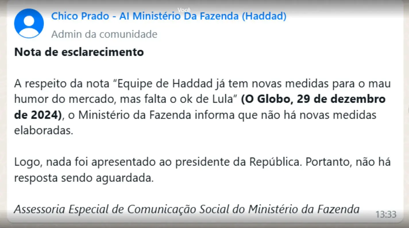 “O Ministério da Fazenda informa que não há novas medidas elaboradas. Logo, nada foi apresentado ao presidente da República. Portanto, não há resposta sendo aguardada”, disse a Fazenda.