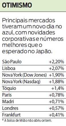 Os principais índices do mercado de ações no mundo fecharam em alta ontem, recebendo suporte de dados que mostraram uma contração menor do que a esperada na economia do Japão durante o segundo trimestre e também por acordos corporativos anunciados nos EUA, sendo o principal deles a aquisição da Motorola Mobility pelo Google por US$ 12,5 bilhões. Mas, hoje, os problemas orçamentários da Europa voltam ao foco do mercado o presidente da França, Nicolas Sarkozy, e a chanceler da Alemanha, Angela Merkel, discutirão a crise no continente durante uma reunião em Paris.