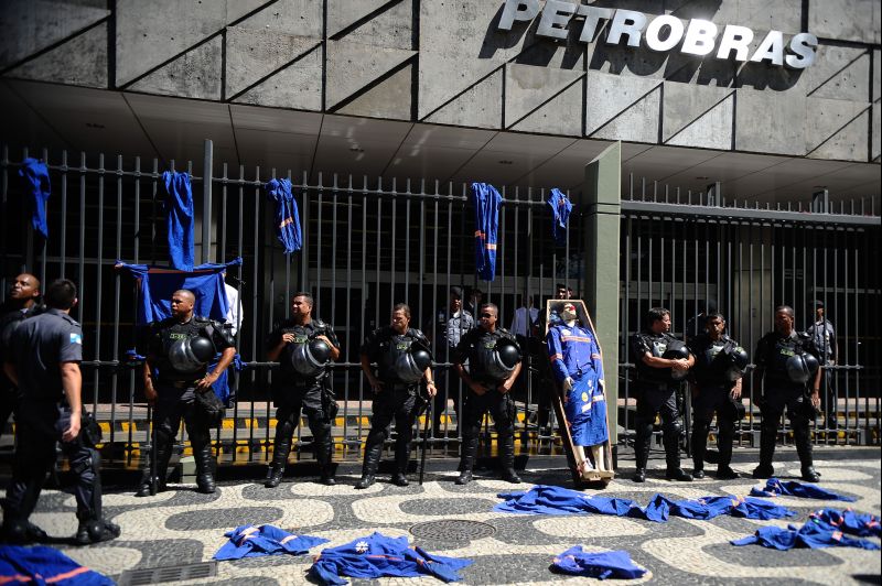 A ponte Rio-Niterói foi interditada por quase três horas ontem, por cerca de 300 funcionários do Complexo Petroquímico do Estado do Rio de Janeiro (Comperj), em construção na cidade de Itaboraí (região metropolitana do Rio). Eles caminharam 20 quilômetros até a sede da Petrobras, no centro do Rio, em protesto contra a demissão de trabalhadores e o atraso no pagamento de salários. Policiais formaram um cordão em frente à Petrobras. Os manifestantes levaram um caixão com um boneco (foto) usando uniforme da Alumini Engenharia, uma das empresas do Comperj. A maioria dos manifestantes era empregado da firma. Pelo menos 2,5 mil empregados estão sem receber salário desde dezembro e 460 já foram demitidos.