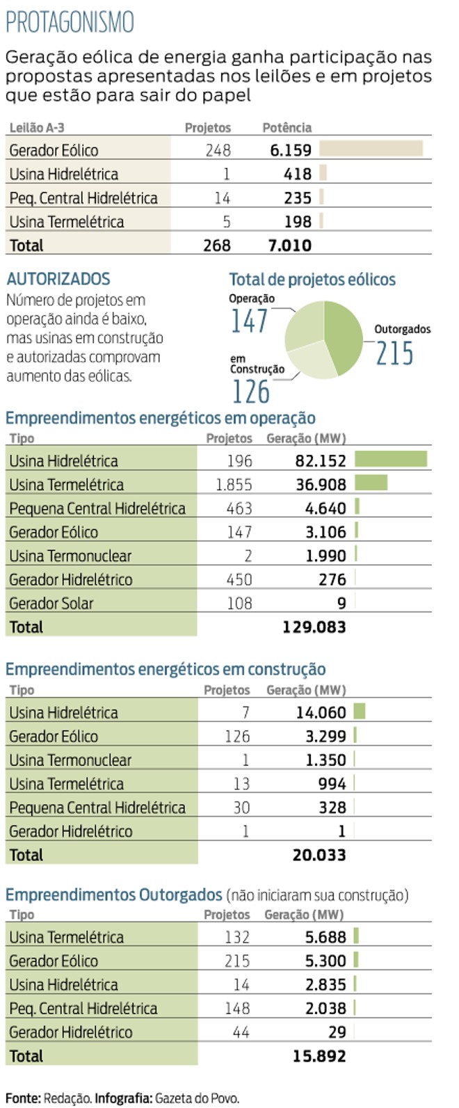 O aumento da popularidade fica evidente no leilão A-3 da Empresa de Pesquisa Energética (EPE), que ocorreu ontem. Dos 268 empreendimentos que estavam no processo, 248 eram de eólicas. No leilão, só foram negociados projetos eólicos e a expansão da usina hidrelétrica de Santo Antônio foram comercializados 80,645 milhões de megawatts-hora (MWh), com um valor contratado total de R$ 10,175 bilhões. Os empreendimentos passarão a oferecer energia em 2017.