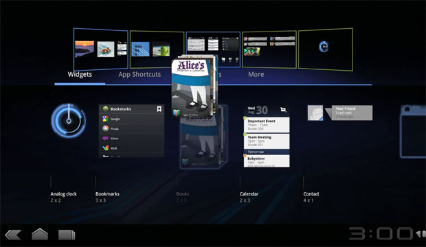 O "Honeycomb" apresenta uma tela inicial configurável e com a possibilidade de se usar widgets, pequenos programas que exibem informações diretamente na área de trabalho como previsão do tempo, notícias e mensagens do Twitter, por exemplo. Ainda, a empresa apresentou o navegador Chrome e a função de leitor digital do novo Android, acessando milhares de livros disponíveis no serviço Google eBooks e acesso à conta do Gmail em uma página especial. A novidade é uma barra superior no aplicativo com atalhos para algumas ações do serviço de e-mails do Google.