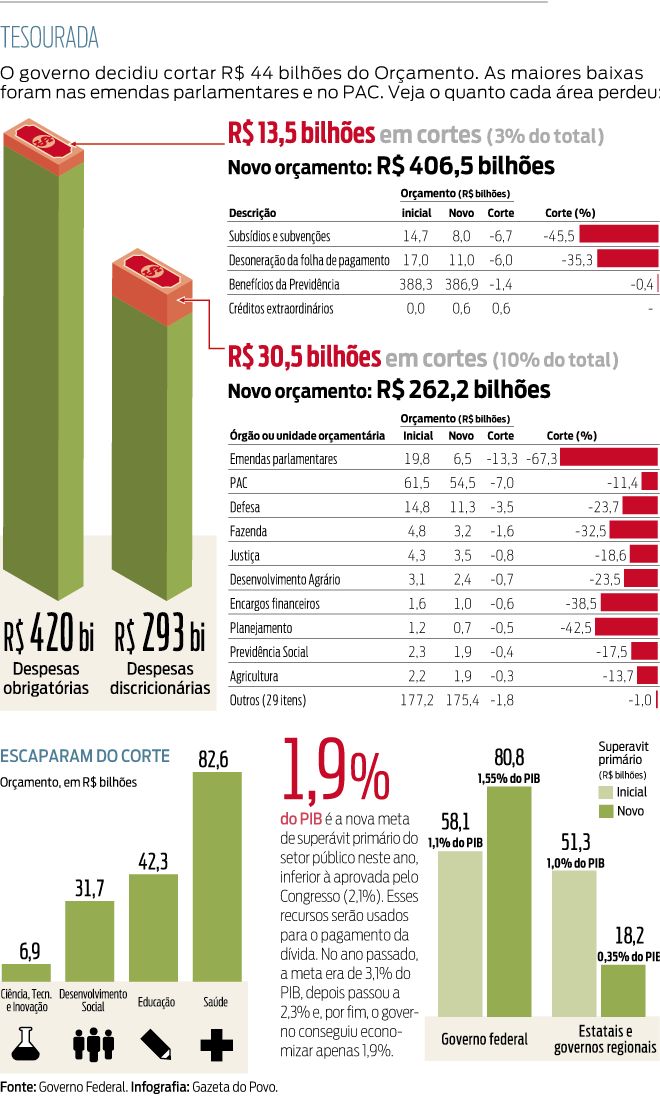 Após meses de expectativas e incertezas dos investidores em relação aos rumos da política fiscal, o governo anunciou um corte de R$ 44 bilhões no Orçamento da União deste ano. O governo vai perseguir uma meta de superávit primário das contas do setor público de R$ 99 bilhões, o equivalente a 1,9 % do Produto Interno Bruto (PIB).