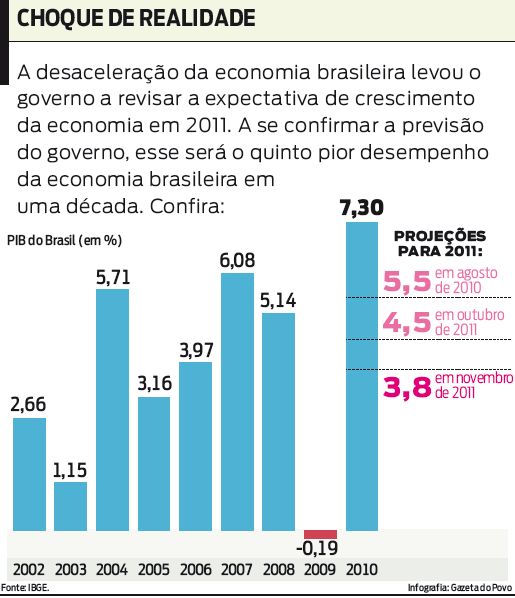 Reconhecendo os efeitos de desaceleração da economia como reflexo da crise internacional, o governo anunciou ontem um corte de 0,7 ponto porcentual de 4,5% para 3,8% na previsão de crescimento do PIB brasileiro em 2011. Esse número indica que o país deixará de crescer R$ 26 bilhões em relação ao PIB de 2010, o que equivale a toda a economia da Paraíba, o 18.º estado mais rico da federação.