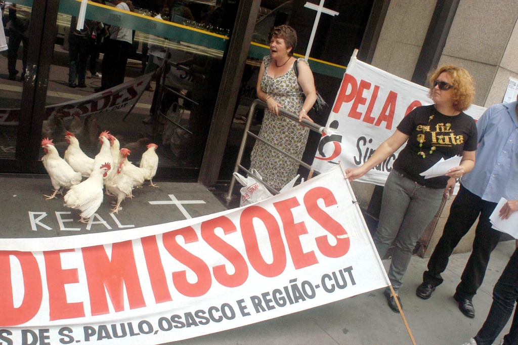 Bancários protestaram ontem contra o corte na Avenida Paulista (região central de São Paulo), em frente a uma agência do Banco Real. Além de faixas, os manifestantes levaram ao ato uma galinha, para representar o que chamaram de "a galinha dos ovos de ouro", expressão usada pelo Santander por ocasião da compra do Real.
