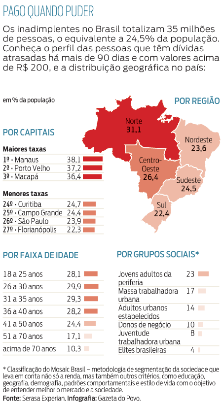 Um em cada quatro brasileiros (ou 24,5% da população) tem dívida superior a R$ 200, revela o mapa da inadimplência do Brasil divulgado ontem pela Serasa Experian. Isso equivale a 35 milhões de pessoas, de acordo com o estudo. A região que concentra mais devedores é a Norte, com 31,1% da população com pendências financeiras, enquanto o Sul é a que menos tem endividados, 22,4%.