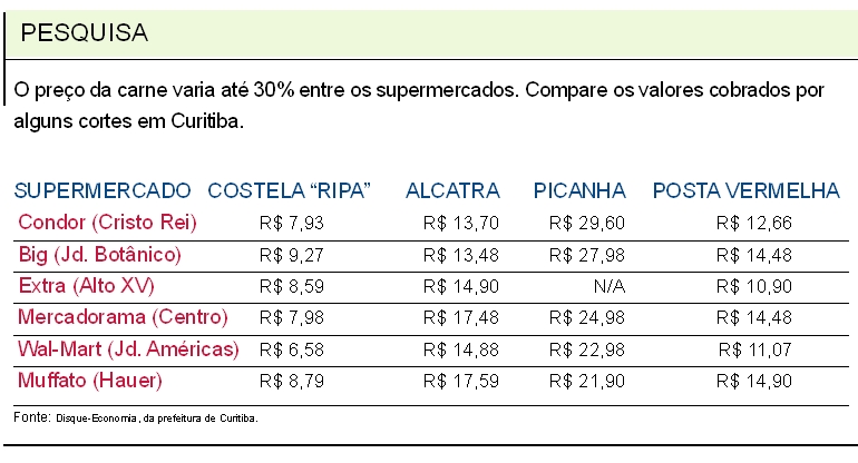 Desde novembro do ano passado, a carne foi reajustada em 38% em Curitiba. Os cortes de primeira, como alcatra e patinho, subiram menos, entre 25% e 30%. A costela foi a campeã de aumentos: está quase 60% mais cara.