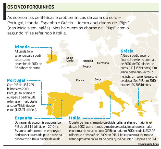 A crise na zona do euro atinge novo patamar ao contaminar os mercados da Itália. O país vinha conseguindo manter-se relativamente isolado da turbulência registrada na periferia europeia, embora já fosse considerado um alvo em caso de maior nervosismo. O sentimento dos mercados globais passou a reagir, nos últimos dias, à situação política da Itália, diante das rachaduras no governo de coalizão do primeiro-ministro Silvio Berlusconi. O principal temor refere-se à possibilidade de saída do ministro das Finanças, Giulio Tremonti.