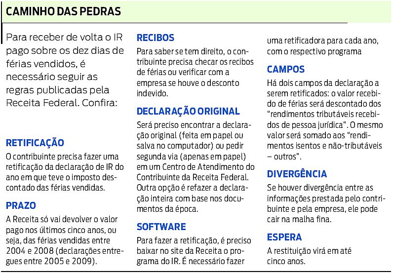 Para ter o dinheiro de volta, o trabalhador terá de retificar as suas declarações do IR nos anos em que vendeu suas férias (leia mais no quadro ao lado). Essa regra só vale para as declarações dos últimos cinco anos, de 2005 (ano-base 2004) até 2008 (ano-base 2007). Quem quiser reaver o IR para períodos anteriores terá de recorrer à Justiça.