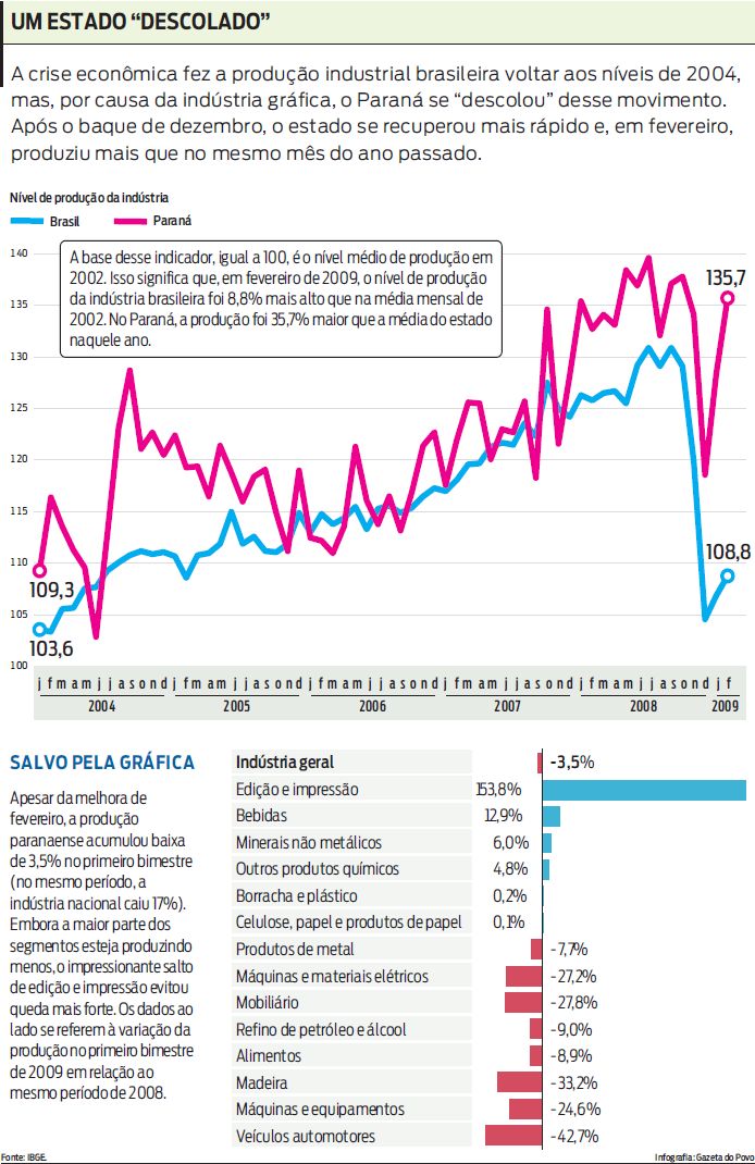 As montadoras produziram 40% menos, as madeireiras cortaram a produção em 33%, os fabricantes de máquinas reduziram o ritmo em quase 30%. Outros cinco segmentos da indústria também encolheram. E, ainda assim, o Paraná conseguiu elevar sua produção industrial em fevereiro, na comparação com o mesmo mês de 2008 feito único entre as 14 regiões pesquisadas pelo Instituto Brasileiro de Geografia e Estatística (IBGE).