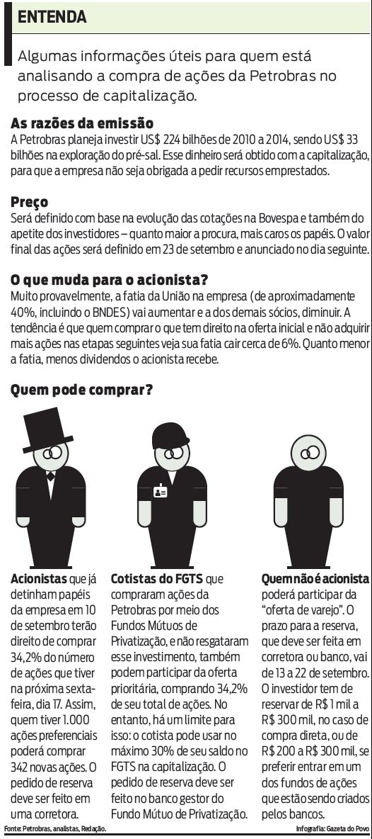 A megaoperação de capitalização da Petrobras, que pode render até R$ 150 bilhões para a companhia, já está em andamento. Os investidores prioritários que até o dia 10 de setembro tinham ações da petrolífera na carteira ou que em 2000 compraram papéis com os recursos do FGTS e os mantiveram intactos têm até quinta-feira para manifestar interesse de subscrever mais papéis. Quem ainda não é acionista da estatal tem até o dia 22 para fazer a reserva. E mesmo quem não embarcar nesse processo tem chance de colher algum fruto. Isso porque, se for bem sucedida, a capitalização deve resultar em alta para outros papéis.