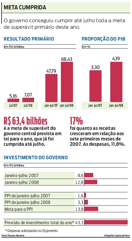 O resultado das contas evidencia um aumento das receitas superior à variação das despesas. Somente no mês de julho, superávit primário foi de R$ 7,06 bilhões. O Tesouro Nacional contribuiu com R$ 9,29 bilhões enquanto a Previdência Social deve um déficit de R$ 2,18 bilhões e o Banco Central registrou déficit de R$ 53,2 milhões. O bom desempenho das receitas foi, de fato, decisivo: em julho somaram R$ 62,84 bilhões e no ano R$ 407,79 bilhões, com uma alta de 17,67% em relação aos sete primeiros meses de 2007.