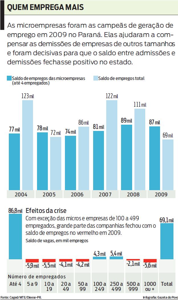 Nem as grandes, as médias ou as pequenas. Foram as microempresas, aquelas com até quatro funcionários, que sustentaram o saldo positivo do mercado de trabalho em 2009 no Paraná. Em meio à crise e às incertezas da economia, elas lideraram a geração de vagas, com quase 87 mil contratações, segundo levantamento do Dieese com base nos dados do Cadastro Geral de Empregados e Desempregados (Caged).