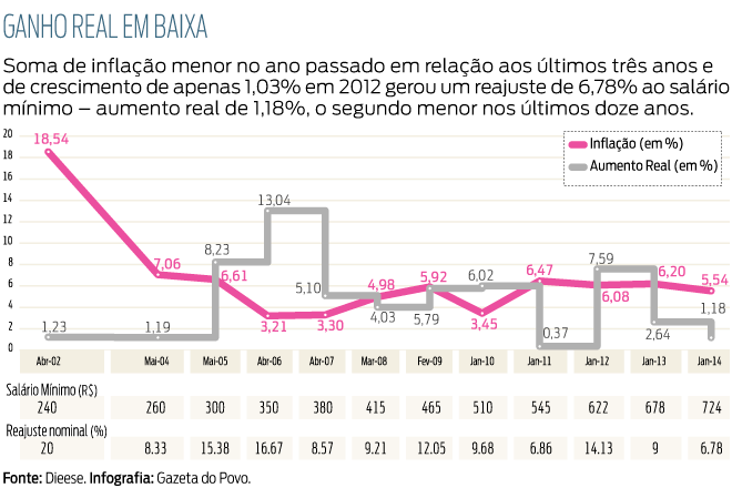 O reajuste do salário mínimo para R$ 724, em vigor desde o dia 1.º de janeiro, teve nesta temporada o segundo menor ganho real dos últimos doze anos, segundo nota técnica divulgada ontem pelo Departamento Intersindical de Estatística e Estudos Socioeconômicos (Dieese). Desde a última quarta-feira o mínimo nacional passou de R$ 678 para R$ 724, uma alta de 6,78%.