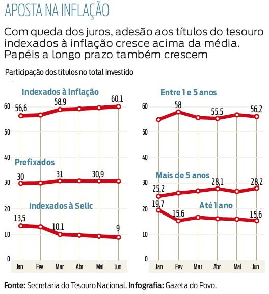 As NTN-B são atreladas ao Índice Nacional de Preços ao Consumidor Amplo (IPCA). Os investidores já notaram a atratividade desses papéis e o resultado tem sido um aumento na proporção desses papéis no total de negócios do Tesouro Direto. De janeiro a junho, o montante aplicado em NTN-B aumentou 21%, enquanto o total aplicado em títulos públicos cresceu 14%.
