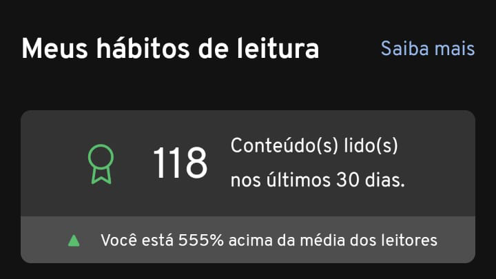 Na tela, é apresentada uma estatística que revela o número de matérias lidas nos últimos 30 dias. A partir dessa informação, o leitor pode explorar uma variedade de dados úteis para entender melhor seus hábitos de leitura, os assuntos mais frequentemente acessados e seu perfil de consumo de notícias.