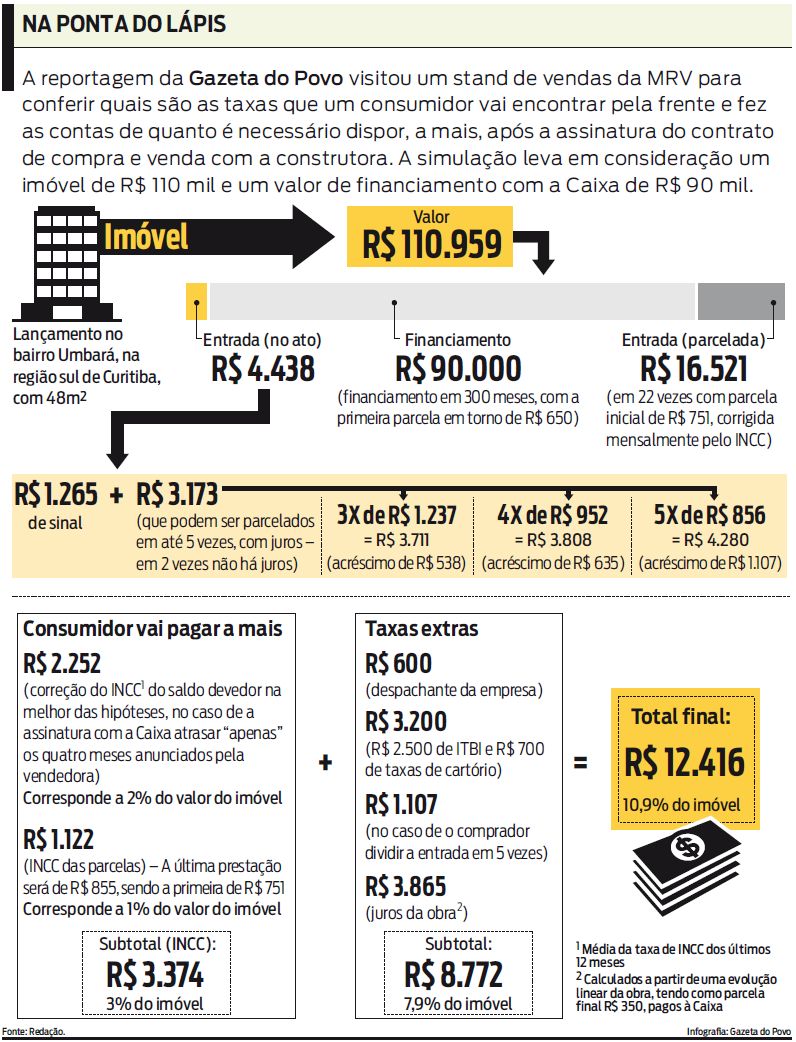 O empresário Michel Oliveira do Prado comprou no ano passado um apartamento na planta no Spazio Celtic, da MRV, em São José dos Pinhais, na região metropolitana de Curitiba. Ele assinou o contrato de compra e venda com a construtora em dezembro do ano passado, com a promessa de que assinaria o financiamento imobiliário com a Caixa em quatro meses. O apartamento, de dois quartos, foi vendido a ele por R$ 101.021. De acordo com a avaliação de crédito feita pela construtora, Prado teria condições de financiar R$ 90.235 e a diferença seria paga em 22 parcelas mensais de R$ 490 entretanto, devido à correção pelo INCC, hoje a parcela já chega a R$ 520.