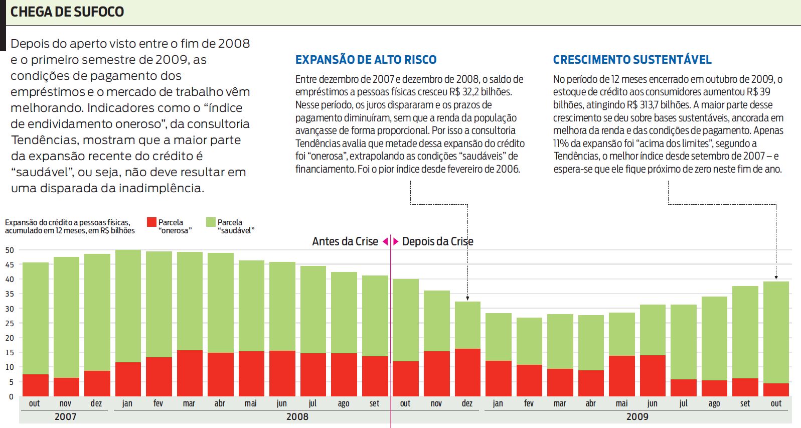 Pelo lado do crédito, a situação varia conforme a modalidade. Mas, de modo geral, as condições de pagamento estão melhores que as observadas antes do estouro da crise. Em novembro de 2008, o juro anual cobrado das pessoas físicas chegou à média de 58%, maior nível em quase três anos; em agosto passado, essa taxa caiu a 44% ao ano, a menor da série histórica do Banco Central, iniciada em 1994. E o prazo de pagamento, que havia encurtado no fim de 2008, alcançou há dois meses o recorde de 513 dias (17 meses).