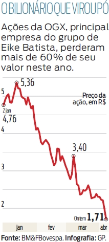 As ações da petrolífera OGX, caíram 13,64% no pregão de ontem da BM&FBovespa, e estabeleceram um novo patamar mínimo histórico. O preço do papel que já chegou a alcançar R$ 23 em outubro de 2010 fechou em R$ 1,71. Desde o início do ano, a empresa perdeu 61% de seu valor de mercado.