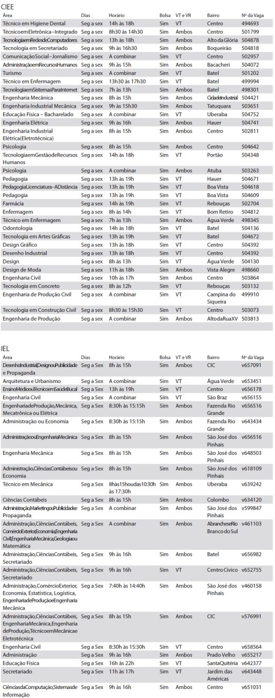 Confira abaixo as principais vagas da semana para estagiários em Curitiba. As oportunidades são oferecidas pelo Instituto Euvaldo Lodi (IEL) e pelo Centro de Integração Empresa-Escola do Paraná (CIEE). Para concorrer a uma vaga do IEL, interessados devem acessar o endereço www.vagas.com.br/ielpr e candidatar-se à oportunidade. Depois, preencha o número da vaga. Para concorrer a uma oportunidade no CIEE, entre no endereço www.cieepr.org.br e faça seu cadastro. Depois, vá em "Pesquise vagas".