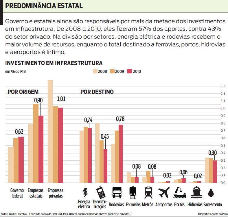 Nos últimos três anos, o Brasil destinou R$ 259 bilhões a obras de infraestrutura, o que corresponde a uma média anual de 2,62% do PIB. O índice é superior às taxas observadas antes do lançamento do Programa de Aceleração do Crescimento (PAC), que raramente iam muito além de 2%, mas não é suficiente nem mesmo para evitar a degradação da infraestrutura que já existe a manutenções das condições atuais exige aportes de 3% do PIB ao ano, segundo o Banco Mundial. A última vez que o Brasil cumpriu esse requisito foi em 2001 (3,32%), com o impulso de fortes gastos do setor de telecomunicações.