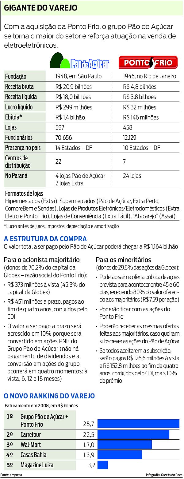 O grupo Pão de Açúcar anunciou ontem a compra da Globex Utilidades, dona da rede Ponto Frio, por R$ 824,5 milhões. Caso os acionistas minoritários da Globex também aceitem a proposta, o valor poderá chegar a R$ 1,164 bilhão. Com a aquisição, a rede, controlada pelo grupo francês Casino, recupera a liderança no varejo brasileiro, ocupada desde 2007 pela também francesa Carrefour.