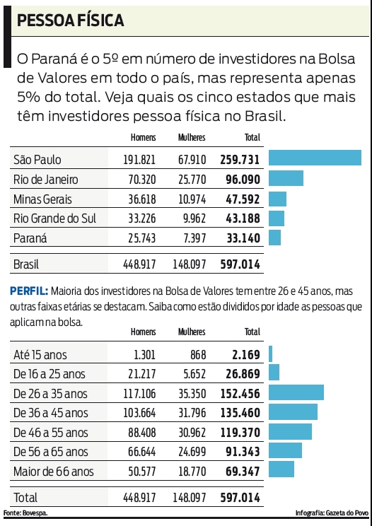 Atualmente, quase 600 mil pessoas investem na bolsa. O Paraná é o quinto estado com mais investidores no país: são 33 mil pessoas físicas que têm contas ativas na bolsa. O estado está atrás de São Paulo, Rio de Janeiro, Minas Gerais e Rio Grande do Sul, na ordem.