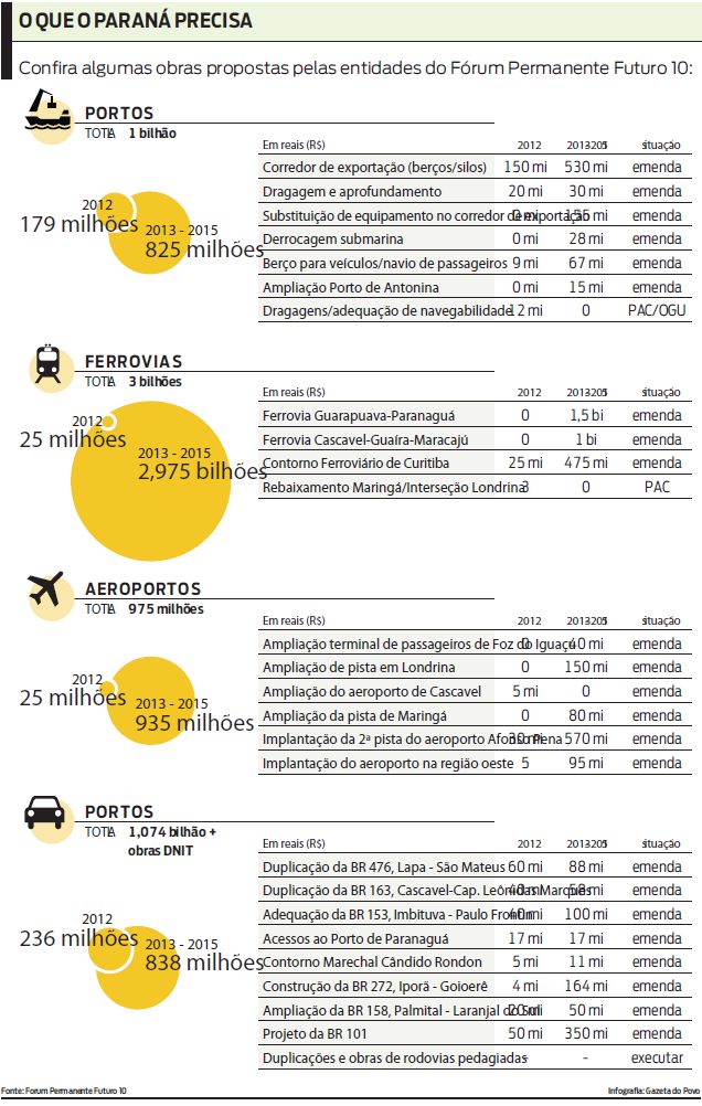 Representantes do Fórum Permanente Futuro 10, que reúne 16 entidades representativas de classe, se encontraram ontem em Curitiba com parte da bancada parlamentar do Paraná em Brasília e o governador Beto Richa para discutir propostas de investimentos na área de infraestrutura de portos, aeroportos, ferrovias e rodovias. O objetivo é viabilizar investimentos da ordem de R$ 6 bilhões para eliminar gargalos que comprometem a competitividade e o desenvolvimento do estado. Desses, calculam as entidades do Fórum, pelo menos R$ 480 milhões poderiam ser incluídos por meio de emendas no Orçamento do governo federal do próximo ano. Outros R$ 5,57 bilhões em projetos poderão ser incluídos no Plano Plurianual de 2013 a 2015.