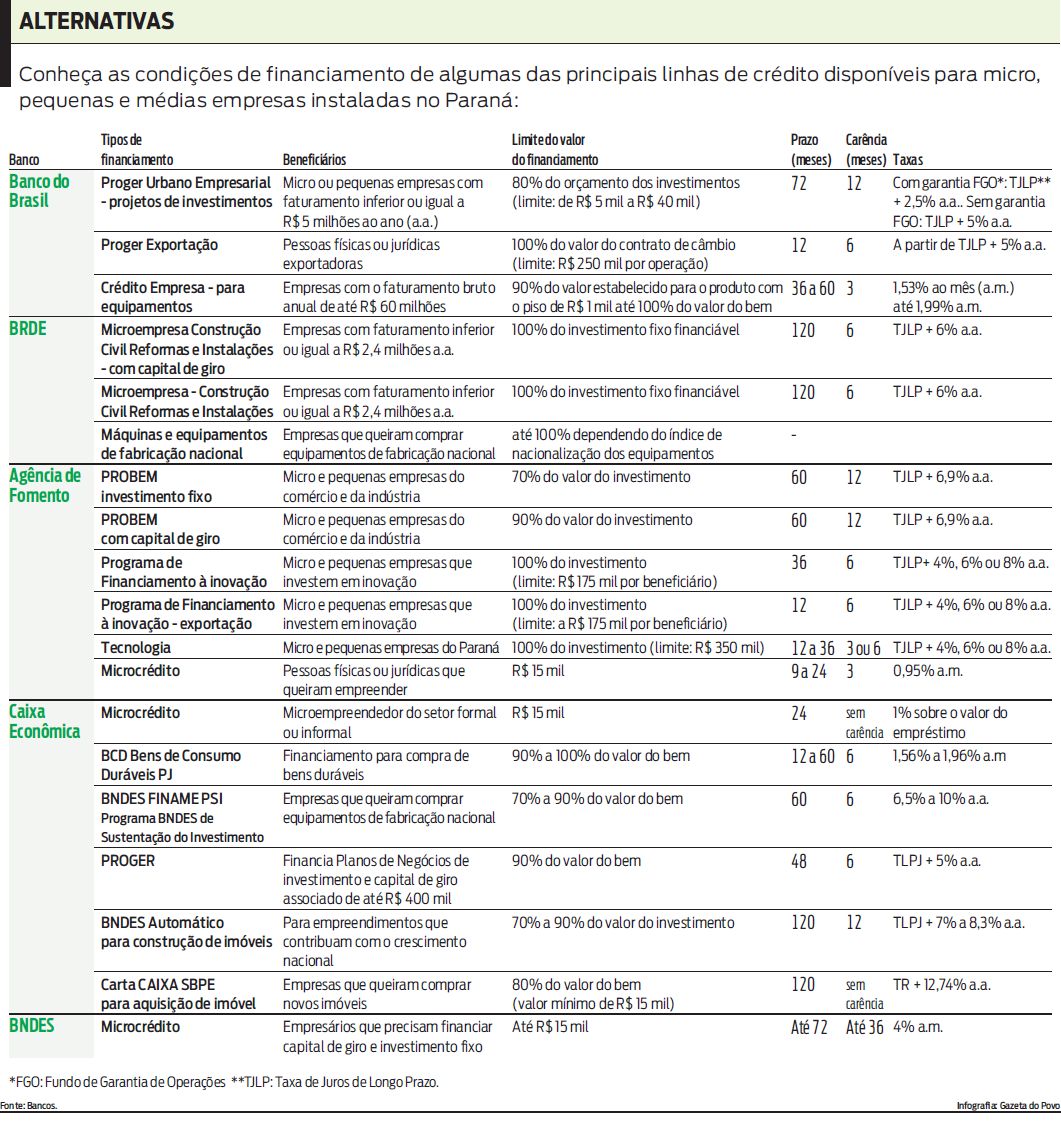 Entre as instituições que tradicionalmente oferecem linhas para empresas de pequeno porte estão o Banco Nacional de Desenvolvimento Econômico e Social (BNDES), o Banco Regional de Desenvolvimento do Extremo Sul (BRDE), a Agência de Fomento do Paraná, o Banco do Brasil e a Caixa Econômica Federal, além das cooperativas de crédito. Mas há novas opões: neste ano o governo federal criou o Programa Crescer, que já começa a operar, e hoje o governo estadual lança o Banco do Empreendedor do Paraná (leia texto nesta página).