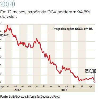 As ações da OGX, petroleira do grupo EBX, de Eike Batista, despencaram 40% ontem na bolsa de São Paulo. No fechamento, o papel atingiu se menor valor histórico: R$ 0,30. Perto do fim da sessão, o Morgan Stanley vendeu 183 milhões de ações da empresa, arrastando a cotação do papel para baixo. Também influenciou a saída da ação da carteira teórica do índice MSCI Brazil a partir da segunda-feira.