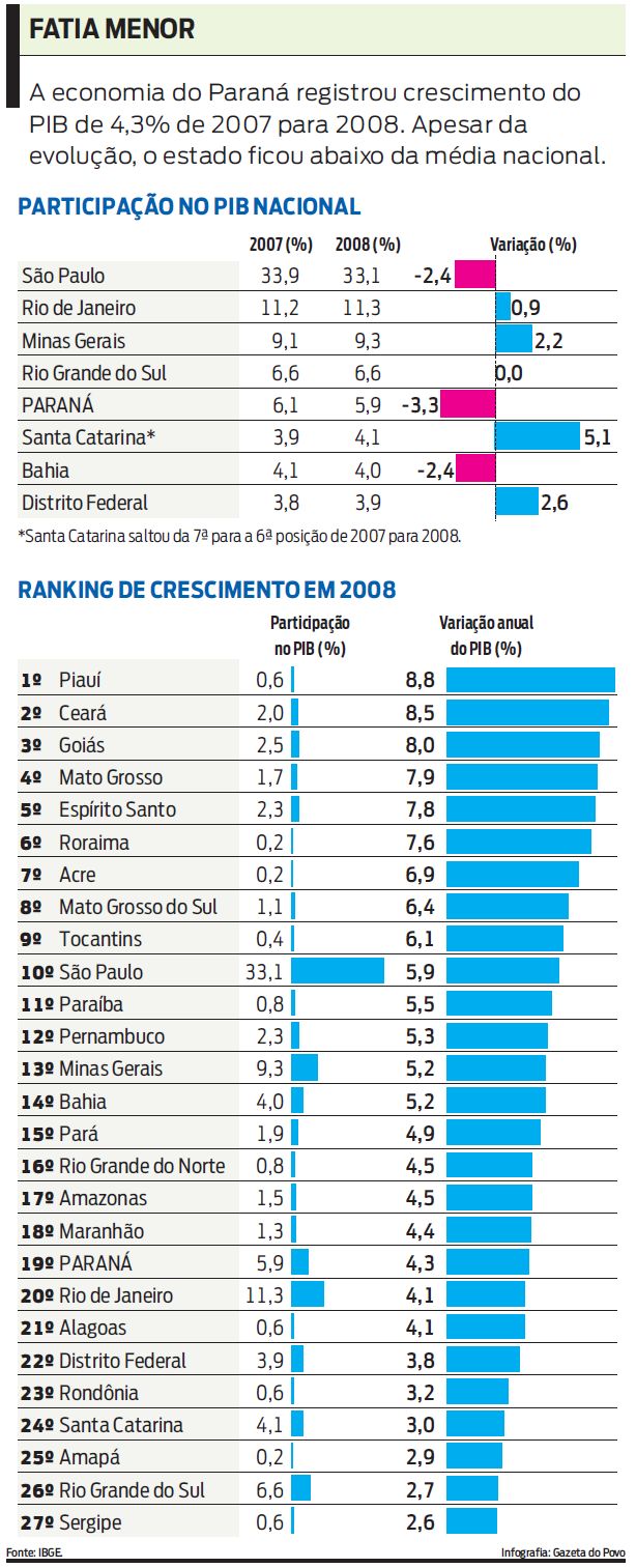 Apesar de o Produto Interno Bruto paranaense ter crescido 4,3% entre 2007 e 2008, segundo dados divulgados ontem pelo Instituto Brasileiro de Geografia e Estatística (IBGE), o Paraná perdeu participação no PIB nacional, caindo de 6,1% em 2007 para 5,9% em 2008. O crescimento do estado ficou abaixo da média nacional, de 5,2%, deixando-o na 19.º posição no ranking de crescimento do PIB estadual.