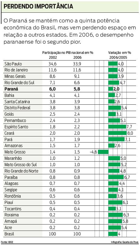 O dado mais recente do Produto Interno Bruto (PIB) regional mostra que o Paraná teve o segundo pior desempenho entre todos os estados brasileiros. Em 2006, a economia paranaense cresceu apenas 2%, contra uma média nacional de 4%. Mato Grosso foi o companheiro do fim da fila: teve retração de 4,6% na comparação com 2005. Os dois estados, bastante dependentes da atividade agropecuária, foram prejudicados pelos baixos preços da soja e milho de dois anos atrás. Os dados fazem parte do levantamento Contas Regionais 2002-2006, divulgado ontem pelo Instituto Brasileiro de Geografia e Estatística (IBGE).