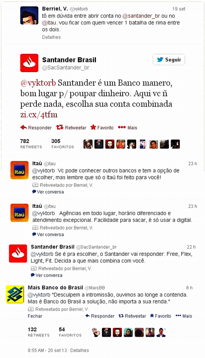 A disputa de dois bancos brasileiros por um novo cliente acabou se transformando em uma "batalha de rimas" na rede social. Vyktor Berriel, 24, publicou uma mensagem no Twitter em que dizia estar em dúvida entre abrir uma conta no Banco Santander ou no Itaú. "Vou ficar com quem vencer uma batalha de rima entre os dois", desafiou o internauta, em publicação feita na quinta-feira. Ambos os bancos responderam à mensagem com versos, cada um destacando vantagens oferecidas aos clientes.