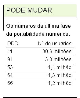 A partir de hoje, todos os usuários de telefonia fixa e móvel do país poderão trocar de operadora sem mudar o número do telefone. A última fase de implantação da portabilidade numérica vai atingir 37,8 milhões de usuários de 362 municípios dos DDDs 53 (RS), 64 (GO), 66 (MT), 91 (PA) e 11 (SP). Com isso, todos os 193 milhões de usuários de todo o país terão acesso à portabilidade.