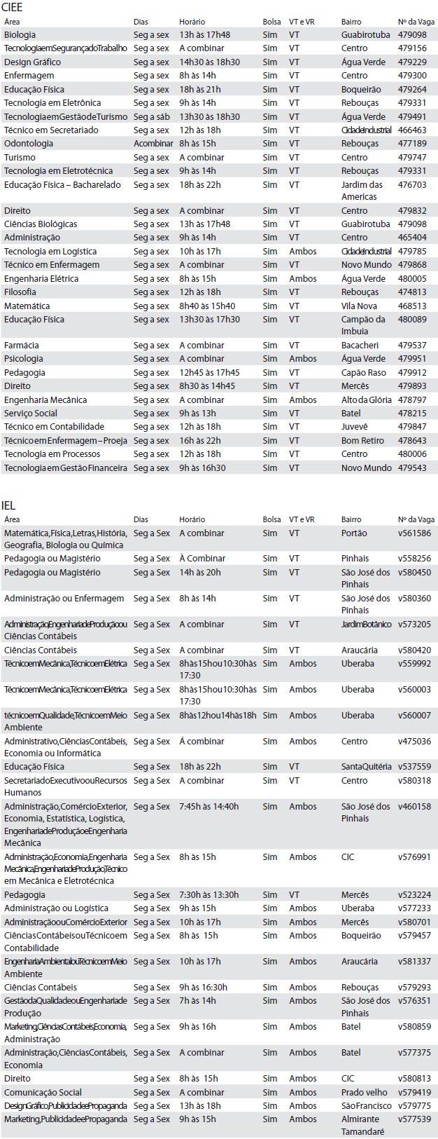 Confira abaixo as principais vagas da semana para estagiários em Curitiba. As oportunidades são oferecidas pelo Instituto Euvaldo Lodi (IEL) e pelo Centro de Integração Empresa-Escola do Paraná (CIEE). Para concorrer a uma vaga do IEL, interessados devem acessar o endereço www.vagas.com.br/ielpr, digitar o número da vaga e candidatar-se à oportunidade. Depois, preencha o número da vaga. Para concorrer a uma oportunidade no CIEE, entre no endereço www.cieepr.org.br e faça seu cadastro. Depois, vá em "Pesquise vagas".