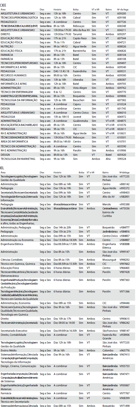 Confira abaixo as principais vagas da semana para estagiários em Curitiba. As oportunidades são oferecidas pelo Instituto Euvaldo Lodi (IEL) e pelo Centro de Integração Empresa-Escola do Paraná (CIEE). Para concorrer a uma vaga do IEL, interessados devem acessar o endereço www.vagas.com.br/ielpr e candidatar-se à oportunidade. Depois, preencha o número da vaga. Para concorrer a uma oportunidade no CIEE, entre no endereço www.cieepr.org.br e faça seu cadastro. Depois, vá em "Pesquise vagas".
