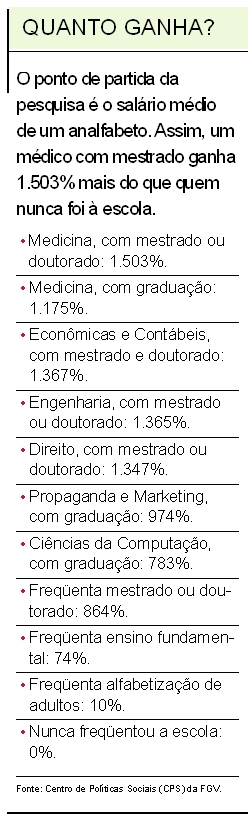 O estudo mapeia os dois extremos da pirâmide social brasileira. De um lado está um analfabeto, cujo salário médio gira em torno de R$ 400. Na outra ponta, um indivíduo com pós-graduação nível atingido após 18 anos de estudos cujo rendimento médio chega a R$ 5 mil.